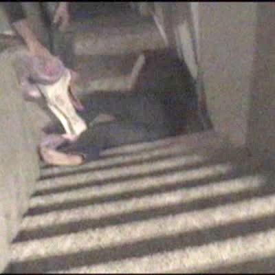 Woman rides big wheel toy tricycle down stairs, crashes. She says "should I have a helmet?" right before she loses her balance and falls. 690503