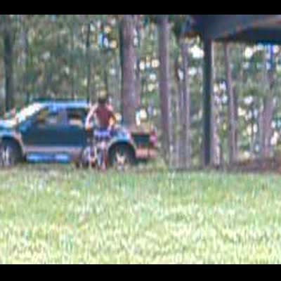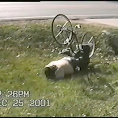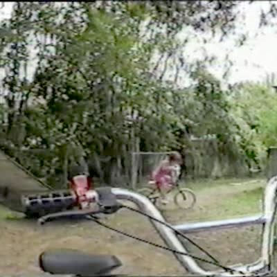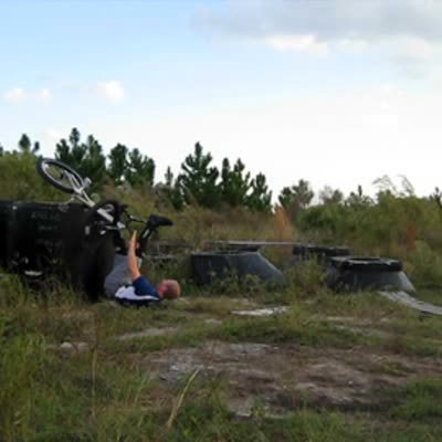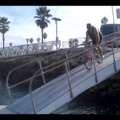 Man rides a child's bike downhill, crashes into a bike ramp and rolls into the lake. NO TAIL. Bonehead.