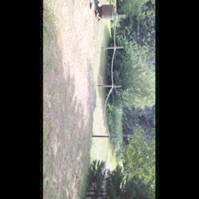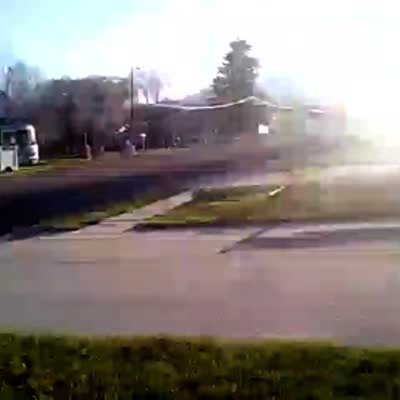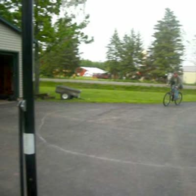Teen boy rides a dirt bike off a ramp in the driveway, crashes into a big pine tree, and disappears from view. Motorcycle.