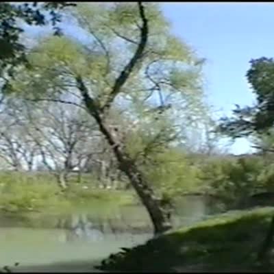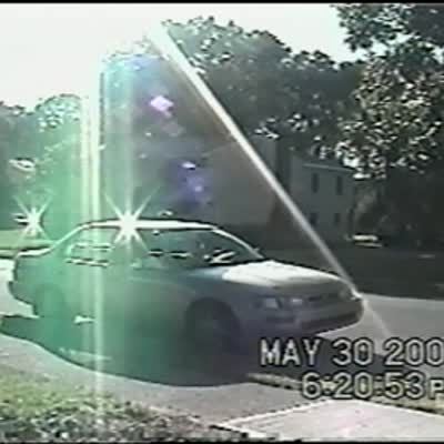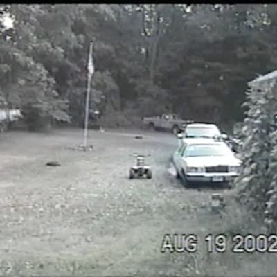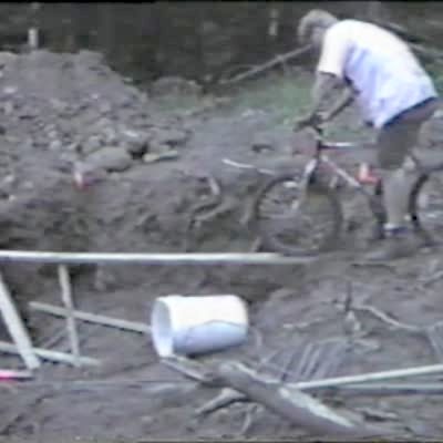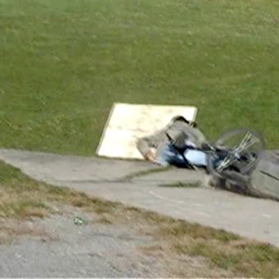 Man on bike attempts to jump off small ramp. Ramp breaks and man goes flying. Date on screen 2002