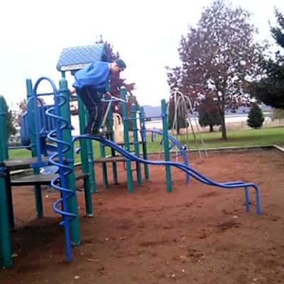 A teenage boy falls and hits his crotch riding a scooter down playground bars. Short tails.