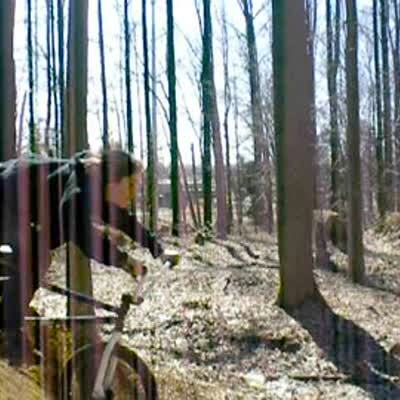 Boy rides bike / bicycle off a jump in a woods, flies off his bike and smashes into a tree.