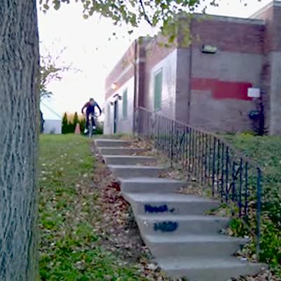 Man rides bike / bicycle up ramp and over tires. He falls off of bike and lands in the grass. No tail. (2103)
