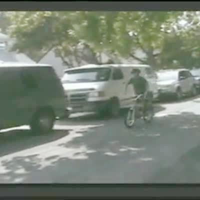 Young man rides a bike off the top of a van & falls into a bush when trying to jump over it. Man laughs & is ok. Stunt. Bonehead.