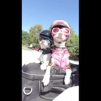 Two chihuahua dogs ride on the back of a motorcycle while wearing helmets and goggles.