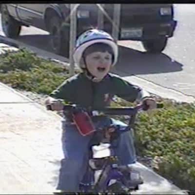Boy falls off bike when another boy holds a 2x4 piece of wood in the air in front of the biker.