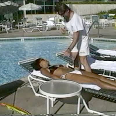 Backyard. Man tickles woman with fake spider on string while she sunbathes with her top undone.