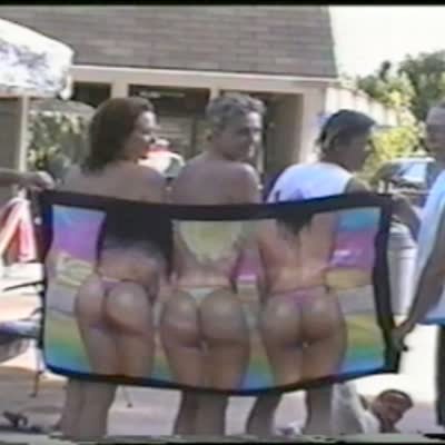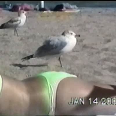 Woman in mesh bikini bottom bounces her butt around on her beach towel.