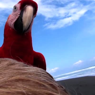 Red parrot bird flies up and lands on woman's shoulder on beach.