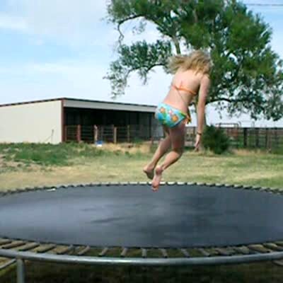 Teen girl in a bikini jumps on a trampoline. Another girl standing on the trampoline falls off. She's ok.