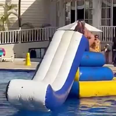 A woman tries to slide down a floating slide in a pool, but she trips at the top and crashes into the water. Featured talent cleared only (woman in the bikini who falls into the water)