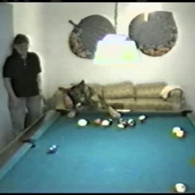 German Shepherd dog keeps putting front paws on pool table chasing the balls. Audio off/ not in sync