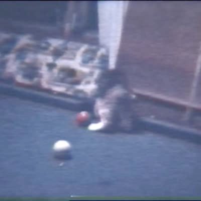 A young girl uses a volleyball to hit a billiard / pool ball in the air. The ball hits and breaks something behind the camera. The camera pans to reveal a broken toilet and pans back to the girl covering her mouth.