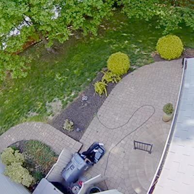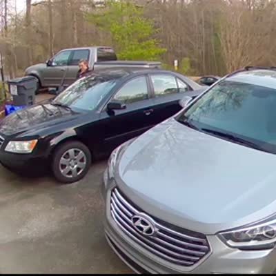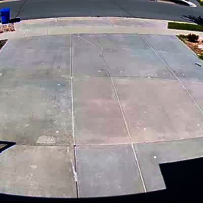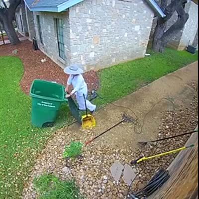 A woman drives a lawnmower up his driveway but she forgets to park it. She falls off and the lawnmower reverses into some trash cans. Security Footage.