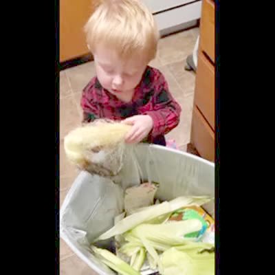 A tot boy shucks corn over a trash can and decides to take a bite, but then his mom tells him he can't eat it yet so he throws it in the trash.