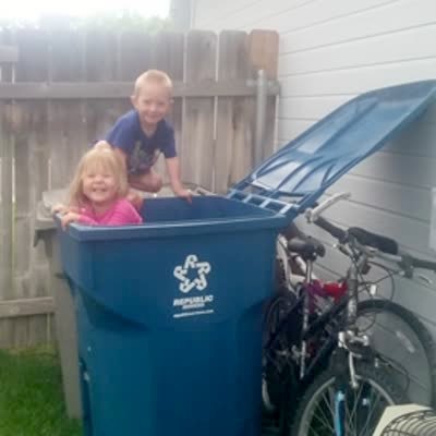 A man in a driveway climbs into a recycling bin to compact the trash. The bin slides out and he falls down. A teen boy gets out of a car and screams and runs over to him.