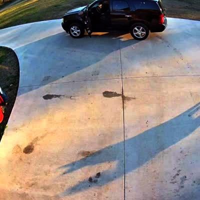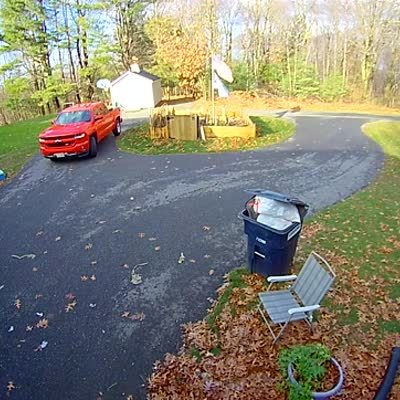 A man steps out of a truck to go into a house and the truck slowly rolls down the driveway. A young girl girl gets out of the truck and screams for the man, and he runs out to stop it, but he trips and the truck crashes into a trash can. Security footage.