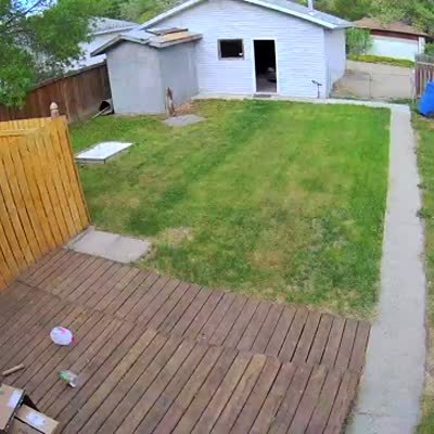 A woman in a yard pushes a trash bin in a yard and trips and falls into the bin. Security camera.