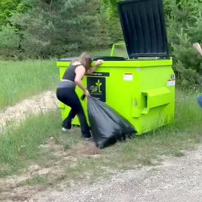 A teen girl tries to throw a large trash bag into a dumpster, but she cannot lift it and the dumpster lid falls on her fingers.