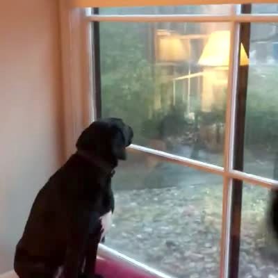 Two dogs inside the house bark at a trash can as it rolls down a rainy street in a front yard.