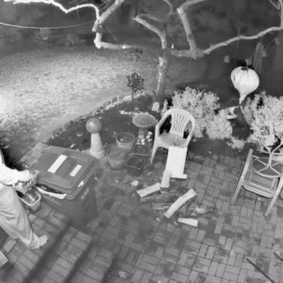 A woman opens a trash can in her driveway to put in a bag and a raccoon jumps out of the bin and runs away. Black and white home security footage. No audio.