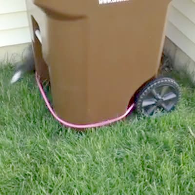 A woman rushes to get his trash can out on trash day, when she yanks at the bin and it falls on top of her and pours rain water all over her while she sits in a yard. Security footage.