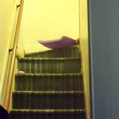 A ferret climbs on a storage bin lid and rides it down the stairs.