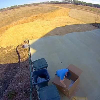 A man pushes a large box over to recycle bins on a driveway, then takes part of it off to put in the bin. He climbs all the way into the large box, then falls and says "I'm okay." Security footage.