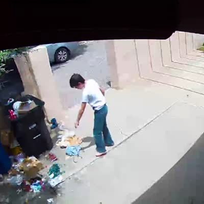 A young boy drags a bag of trash to a garbage bin in his yard, it breaks and spills everywhere as he lifts it, then he leaves the mess and walks back inside. Security footage.