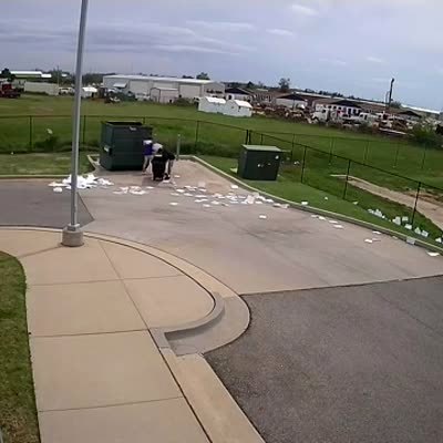 Two teen boys repeatedly try to throw recyclables into a dumpster but the wind blows everything onto the floor. Security camera footage.