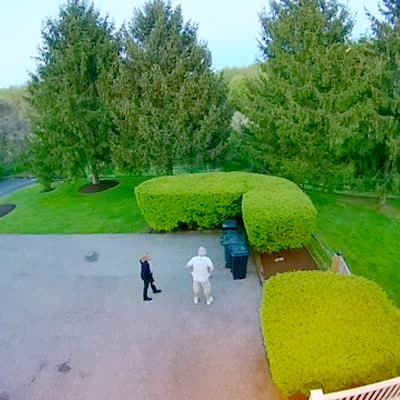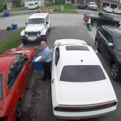 A senior man throws a paper airplane from his driveway, then laughs when it lands in a recycle bin at the end of the driveway. Security footage.