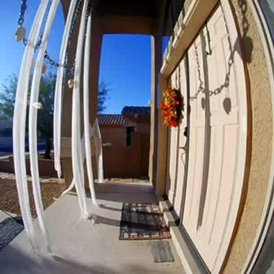 A man and a woman take the garbage cans up the driveway but the wind is so strong that the lid hits the wife in the head and she falls down. Security Footage.