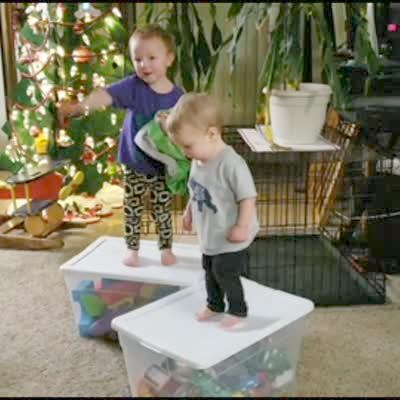 Two tot boys stand on plastic bins. One of them spins in circles and spins and falls off, but keeps singing.