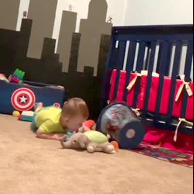 A tot boy puts an Avengers bucket on his head then laughs and runs through his bedroom into a wall and falls over.