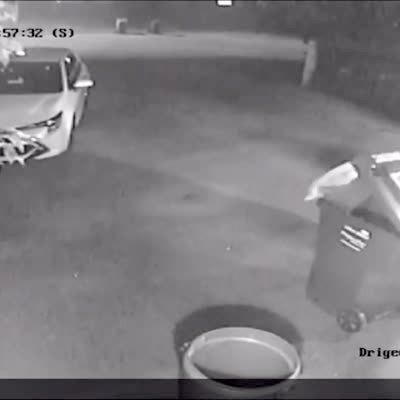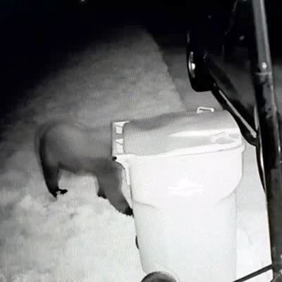 A small bear walks up the driveway and grabs a trash bin with its teeth and rolls it away. Security footage, dark, night