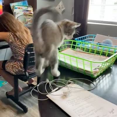 A kitten cat steps into a bin of papers and falls off of a table in the house.