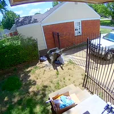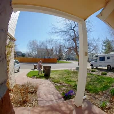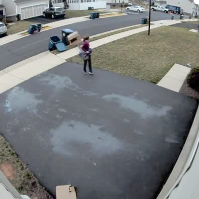 A woman puts a piece of paper in a cardboard box by her trash bins, and then a large gust of wind blows over all of the trash cans in the neighborhood and papers fly out. Security footage.