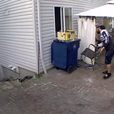 A man tries to push a trash can down the side of a house and falls into the bin and hits his head on it. Home security footage.