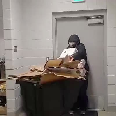 A man in the garage steps into the recycling bin to crush down the boxes inside. The bin falls over with him in it. Security Footage