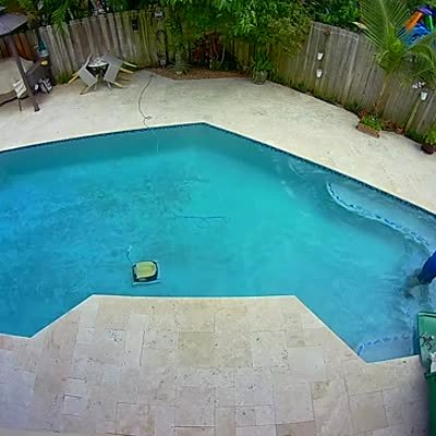 A man attempts to pull out a trash container but the bin is too heavy so when he pulls it out the container falls forward and knocks him into a backyard pool.