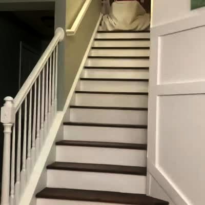 A man sits on a cushion and a blanket and sleds down a staircase. A dog follows him down. The man hurts his bottom.