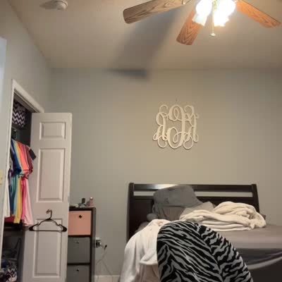 A teen girl jumps around and spins in a bedroom, but her leg gets stuck in a blanket, and she falls.