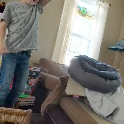 A young boy jumps onto a tower of pillows and blankets and he tips over and falls to the ground in living room.