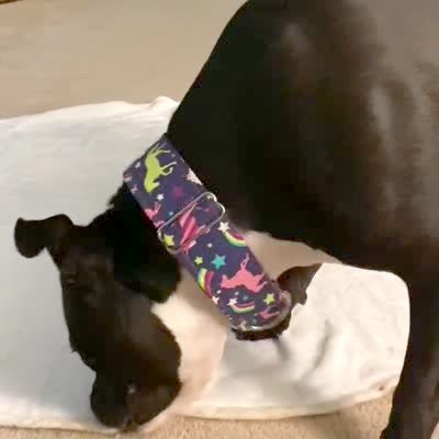 A woman tells her Pitbull dog, "Burrito!" and the dog rolls in a blanket that looks like a tortilla in the living room.