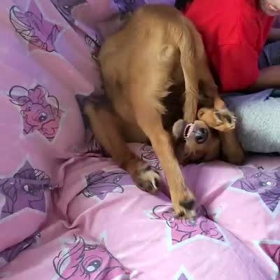 A man does the "Disappearing Human Trick" in front of his golden retriever, but he hits his head on the wooden base of the bed, and his dog comes over to check on him.