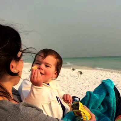 A woman holds a tot girl on her lap on the beach. The tot girl holds out a chip for the woman and a seagull flies in and grabs the chip out of the girl's hand.