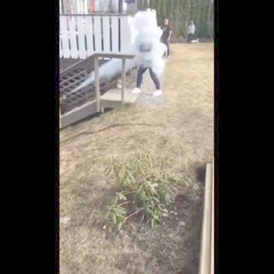 In a backyard, a young boy throws a plastic bottle bomb made by mixing water, vinegar, and baking soda in the bottle. The bomb explodes and blasts all over the boy. He screams and runs to the house.