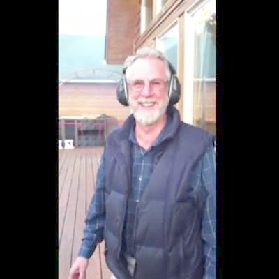 Boy on a shipyard dock in evening introduces himself to the camera. Suddenly a huge ship's foghorn blasts and startles him.