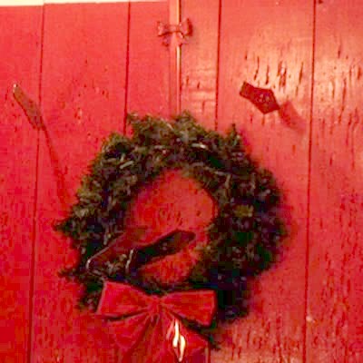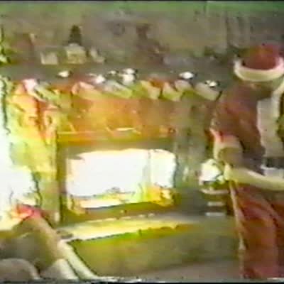"Christmas Combustion" Man's Santa hat, coat, and wreath catch fire from a candle as he and woman are filming Christmas video. Costume.