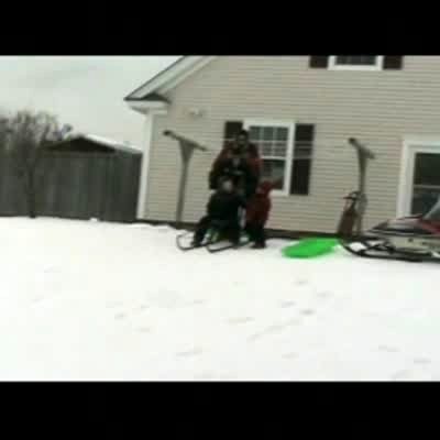 Man & young boy try to ride an old fashioned kick sled (which had blades on the bottom). Man flips over the front of the sled and lands on his son. Winter.